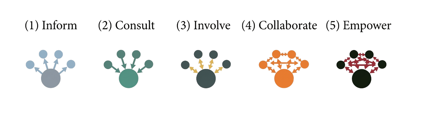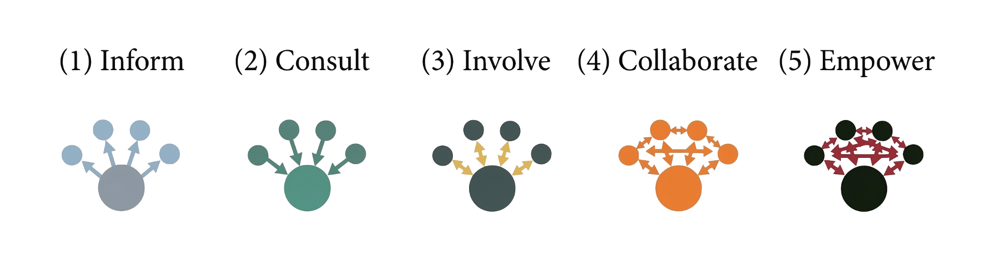 And beyond (4) collaboration lies the question of (5) empowerment as structure. What would it mean for engagement to move from extraction to circulation and to redistribution? Practically, this would require a shift that is both simple and profound: to stop ending at data collection, and begin involving people in interpretation; to stop presenting insights as fixed truths, and instead treat them as propositions to be negotiated; to build long-term relationships with communities rather than one-off engagements; to compensate not only for time, but for intellectual contribution; and to establish feedback loops that make visible what has changed as a result of participation.